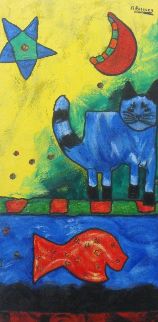 Een globale impressie van het schilderij "Lachende vis bij maanlicht" 40x80cm.