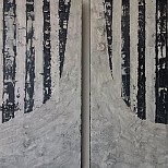 Schilderij met vele kleuren, bedekt met een afgesleten laag metselwerk, een stukje oude muur wat zijn kleurtjes weer laat zien.