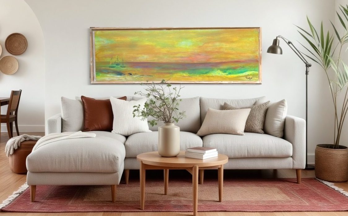 Verschillende materialen op een paneel van 120×40 cm in een white wash massief houten Tonio lijst.
